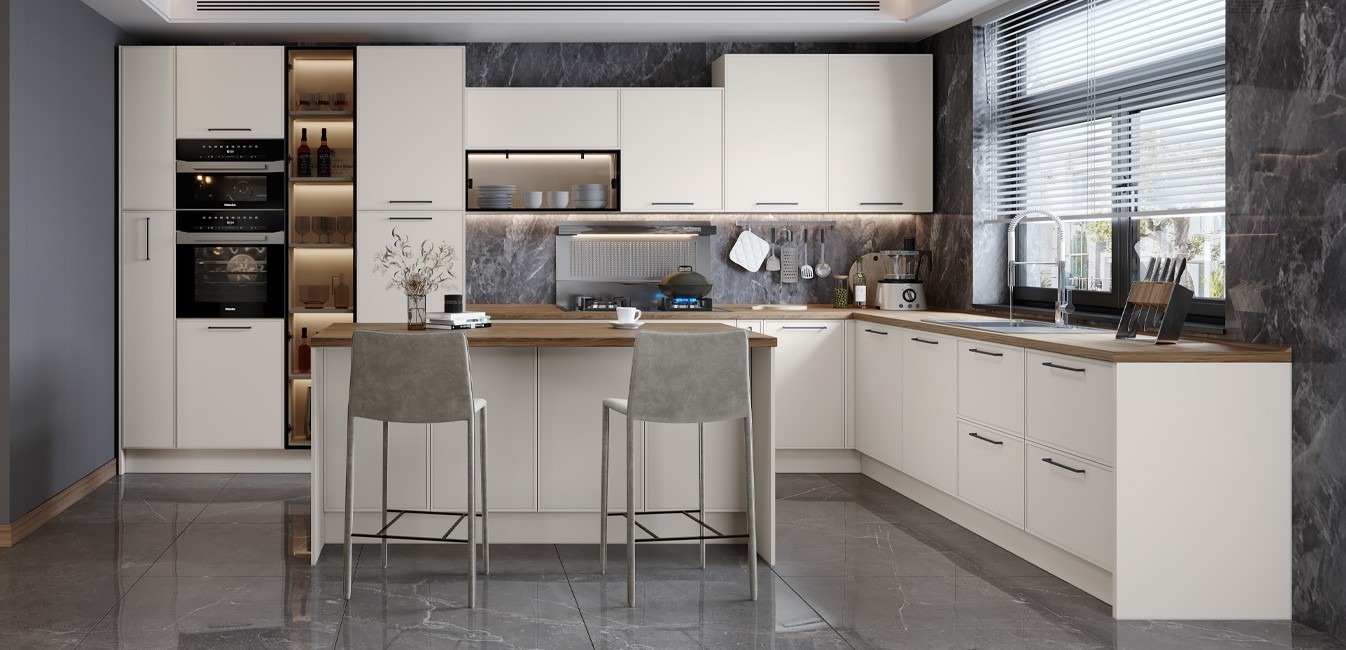 • front sa profilisanim MDF ramom lakiran UV lakom u boji kašmira sa mat efektom