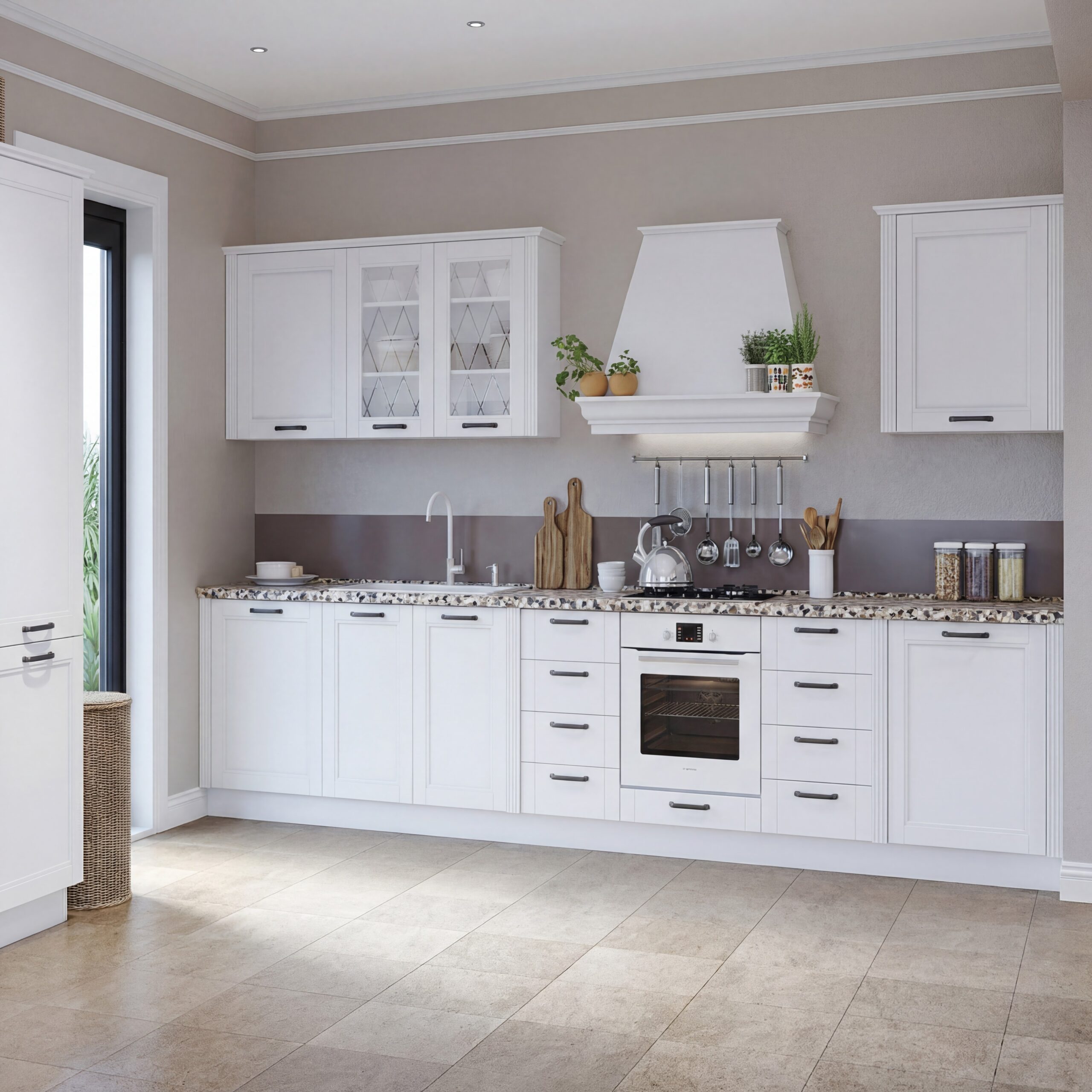 - istaknite bočne strane kuhinje ugradnjom dodatnih panela u drvo dekorima Bela, Pacifik orah i Nebraska Hrast koji su deo dodatne opreme